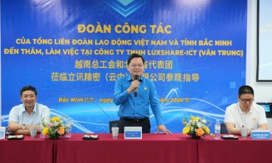BẮC NINH - Sáng 3/4, tại Khu công nghiệp Vân Trung (phường Nếnh), đoàn công tác của Tổng Liên đoàn Lao động Việt Nam do đồng chí Nguyễn Anh Tuấn, Ủy viên Trung ương Đảng, Chủ tịch Tổng Liên đoàn Lao động Việt Nam làm trưởng đoàn đến thăm, làm việc tại Công ty TNHH Luxshare - ICT. Buổi làm việc tập trung đánh giá tình hình sản xuất, chăm lo đời sống công nhân và tháo gỡ vướng mắc liên quan đến hạ tầng, điều kiện làm việc của người lao động.