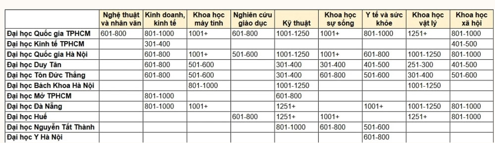 Ở lần góp mặt đầu tiên, Đại học Đà Nẵng được xếp hạng trong 6 nhóm, thành tích tốt nhất là hạng 801-1000 ngành Kinh doanh, Kinh tế và Khoa học xã hội. Còn Đại học Nguyễn Tất Thành có mặt trong ba nhóm, cao nhất là hạng 501-600 ngành Y tế và Sức khỏe.