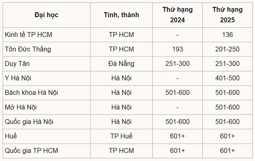 Trong lần đầu vào bảng xếp hạng này, Đại học Kinh tế Thành phố Hồ Chí Minh ở vị trí 136, soán ngôi số 1 Việt Nam của trường Tôn Đức Thắng (tụt từ hạng 193 năm ngoái xuống 201-250 năm nay). Đại học Mở Thành phố Hồ Chí Minh có bước nhảy vọt, từ không được xếp hạng vào nhóm 501-600.