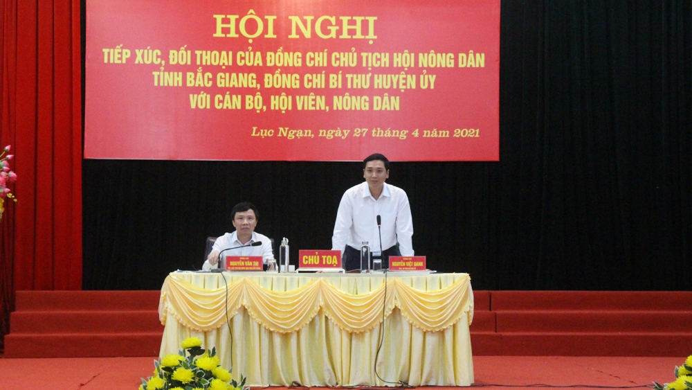 (BGĐT) - Ngày 27/4, Hội Nông dân (HND) tỉnh, Huyện ủy Lục Ngạn phối hợp tổ chức tiếp xúc, đối thoại với cán bộ, hội viên, nông dân huyện Lục Ngạn. Chủ tịch HND tỉnh Nguyễn Văn Thi, Bí thư Huyện ủy Lục Ngạn Nguyễn Việt Oanh chủ trì. Dự buổi tiếp xúc, đối thoại có đại diện lãnh đạo các phòng, ban, ngành của huyện và hơn 300 cán bộ, hội viên, nông dân trên địa bàn.
