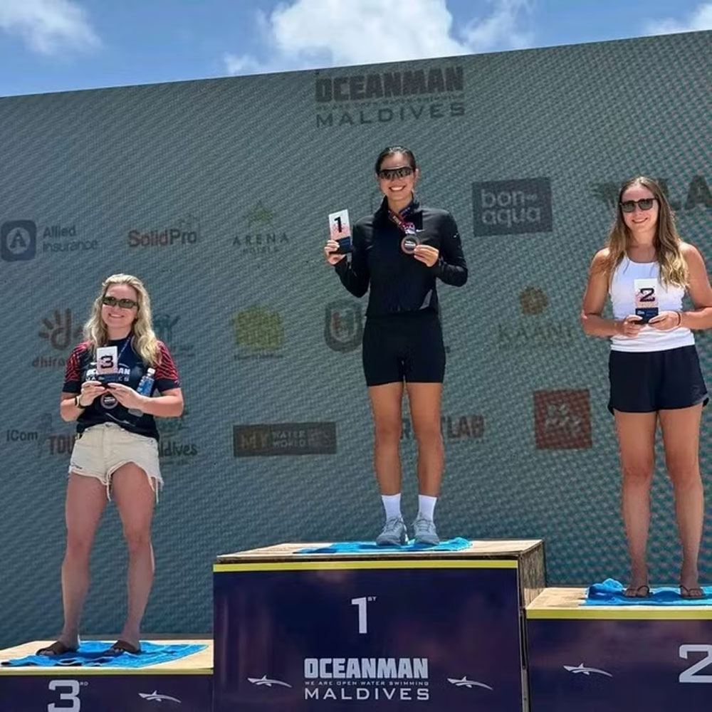 Ánh Viên trên bục nhân giải nhất nội dung 10km giải bơi biển Oceanman Maldives 2026. |