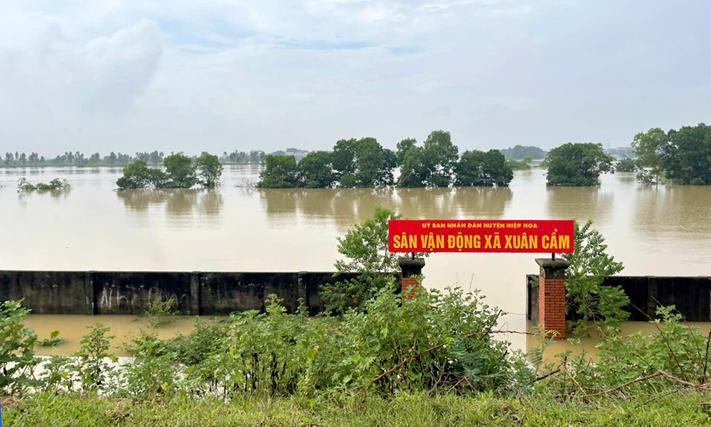 Nước sông dâng cao ngập sân vận động xã Xuân Cẩm. |