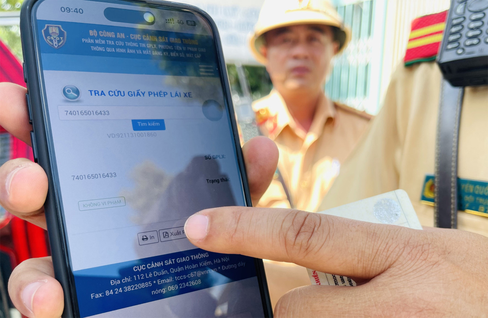 Lực lượng CSGT kiểm tra tình trạng giấy tờ của lái xe trên môi trường điện tử qua thiết bị và trang website nghiệp vụ. |