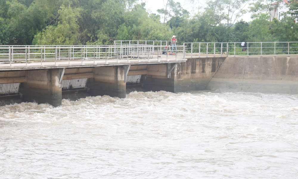 Trạm bơm Văn Sơn hoạt động hết công suất để kịp thời bơm tiêu nước ra sông Thương. |