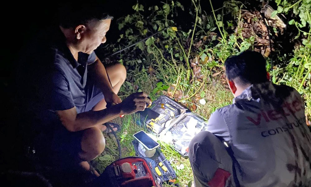 Nhân viên kỹ thuật Viettel Bắc Giang khắc phục sự cố mất thông tin liên lạc do mưa bão ngay trong đêm. |