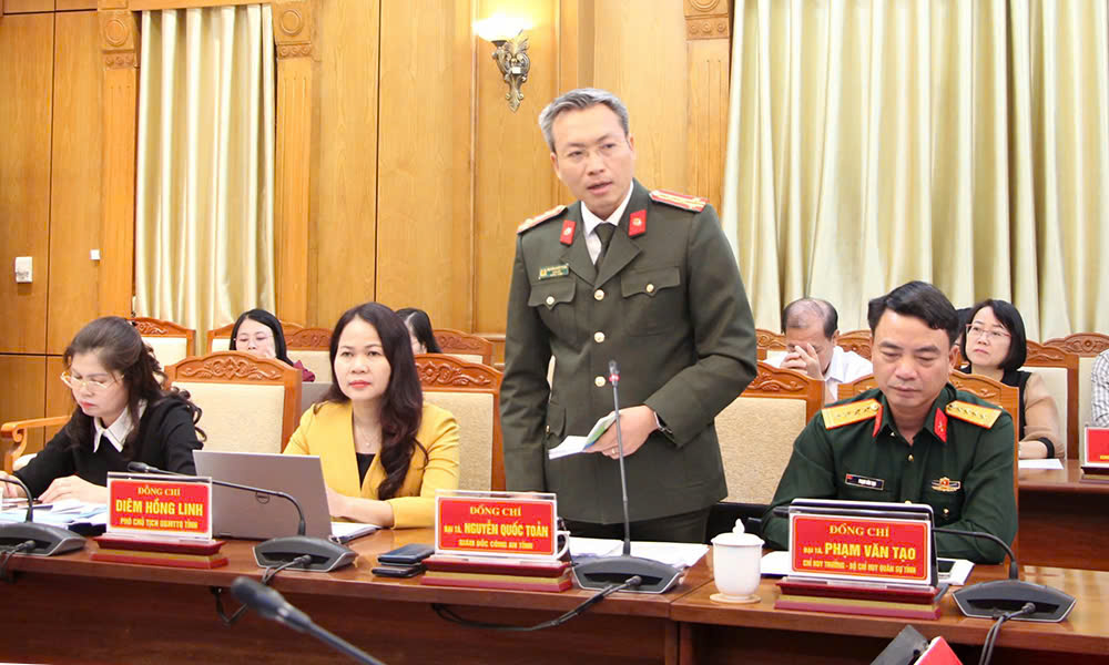 Đại tá Nguyễn Quốc Toản, Giám đốc Công an tỉnh nêu một số vấn đề về an ninh trật tự trên địa bàn. |