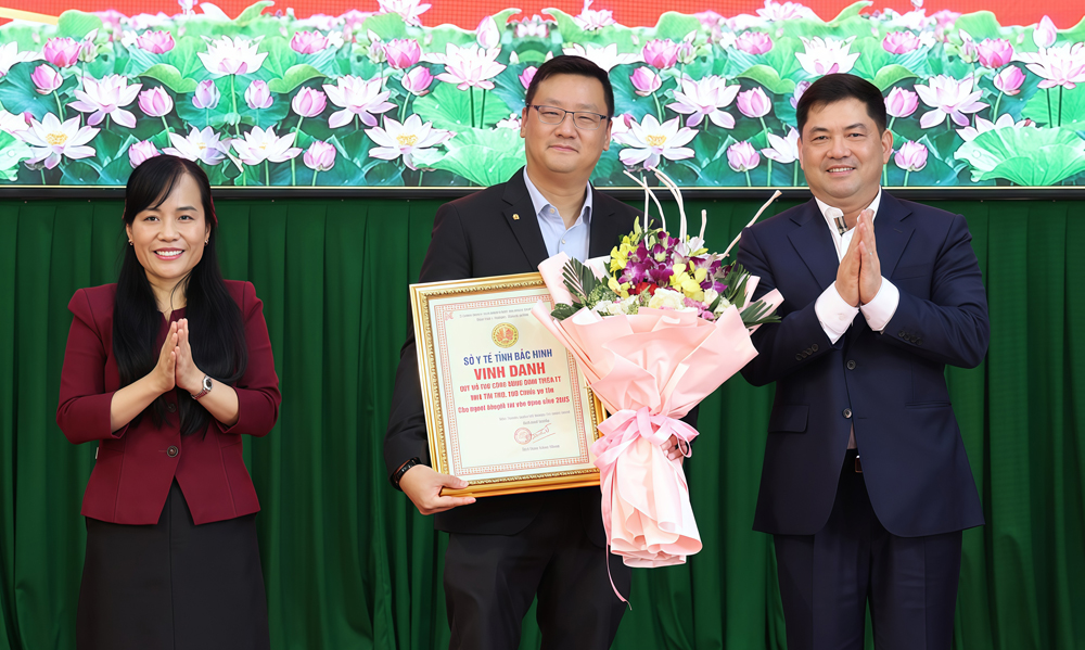 Đồng chí Nguyễn Hồng Thái và lãnh đạo Sở Y tế tặng chứng nhận vinh danh Quỹ Hỗ trợ cộng đồng Đinh Thiện Lý. |