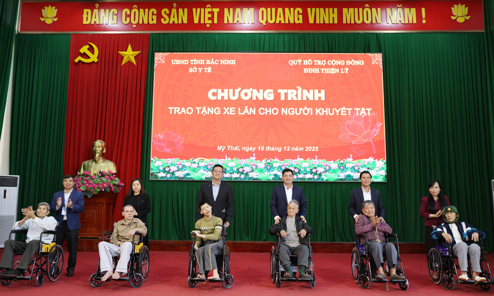 BẮC NINH - Chiều 18/12, tại xã Mỹ Thái, Sở Y tế Bắc Ninh, Quỹ Hỗ trợ cộng đồng Đinh Thiện Lý (thuộc Tập đoàn Central Trading and Development) phối hợp tổ chức trao tặng xe lăn cho người khuyết tật trên địa bàn tỉnh.