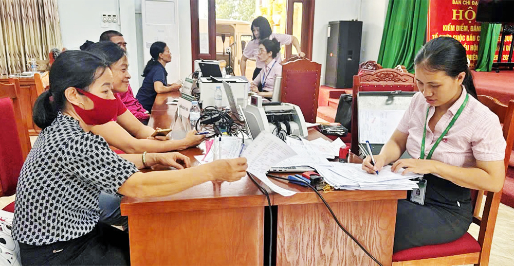 Cán bộ Chi nhánh Ngân hàng Chính sách xã hội tỉnh hướng dẫn người dân làm thủ tục vay vốn phát triển sản xuất. |