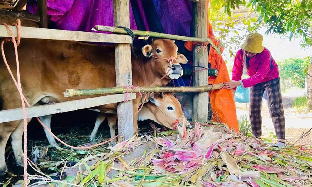 Gia đình bà Nịnh Thị Thảo, thôn Tân Chung, hiện đang nuôi 2 con bò. Chuẩn bị cho mùa đông, bà Thảo đã dự trữ rơm, ngô để bảo đảm nguồn thức ăn cho vật nuôi. Do thời tiết rét đậm về đêm, sáng sớm, gia đình bà chủ động che chắn chuồng trại, hạn chế chăn thả, tránh cho bò bị nhiễm lạnh.