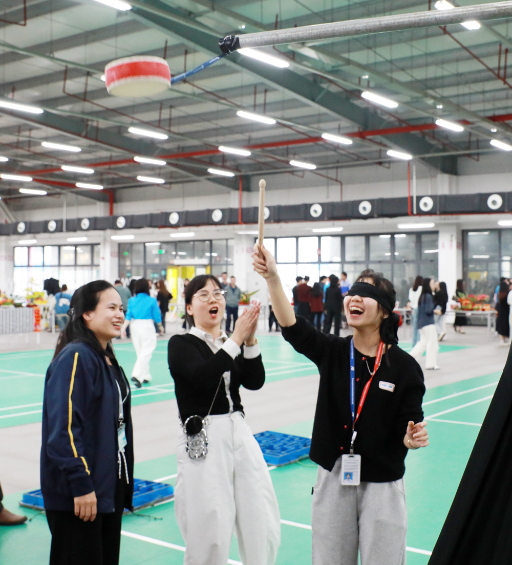 Đoàn viên công ty tham gia trò chơi "bịt mắt đánh trống". |