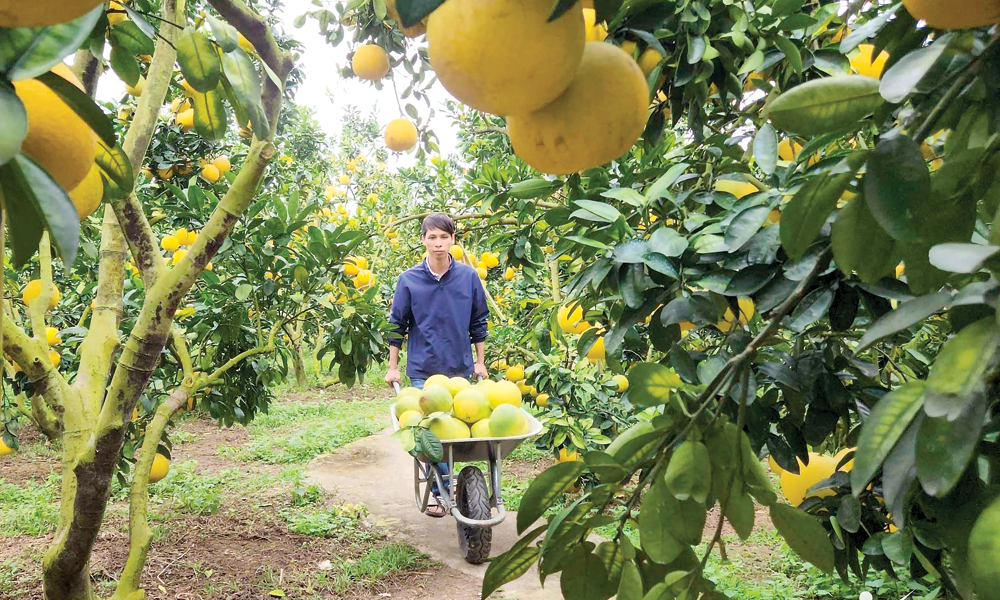 Sản xuất nông nghiệp xanh đang trở thành xu hướng phát triển được người dân trên địa bàn tỉnh áp dụng. Ảnh: Thu hoạch bưởi tại một hộ dân ở phường Chũ. |