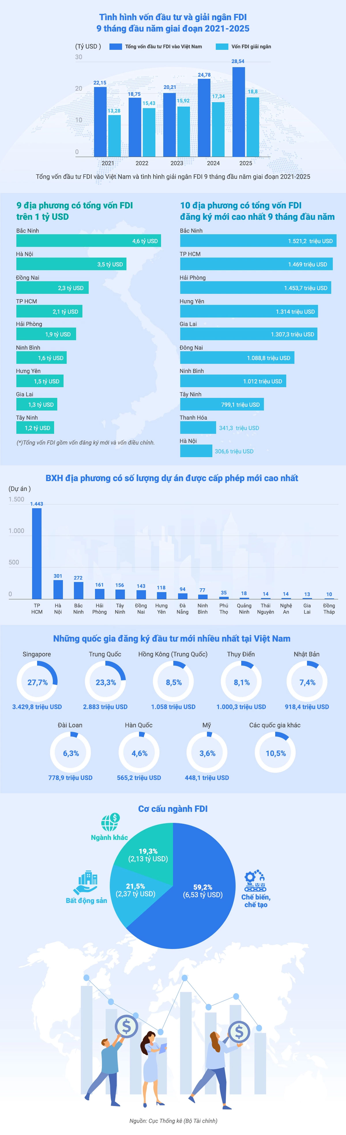 9 tháng đầu năm, cả nước ghi nhận 28,54 tỷ USD vốn đầu tư trực tiếp nước ngoài (FDI), tăng 15,2%, trong đó Bắc Ninh dẫn đầu top 10.