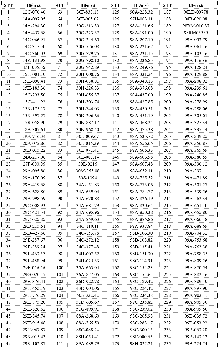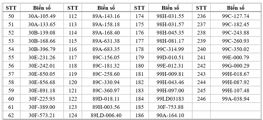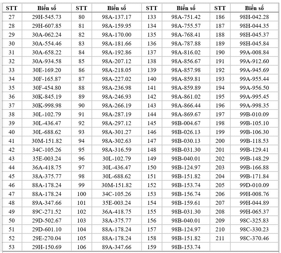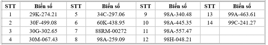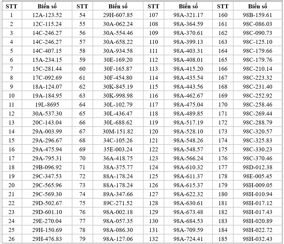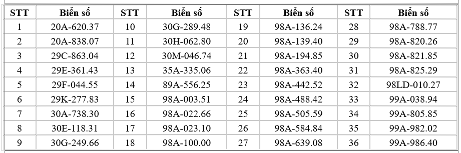 Thông tin tra cứu trên website chính thức của Cục Cảnh sát Giao thông: https://www.csgt.vn/tra-cuu-phuong-tien-vi-pham.html. Các chủ phương tiện có tên trong danh sách chủ động liên hệ Phòng Cảnh sát giao thông Công an tỉnh Bắc Ninh hoặc các đội cảnh sát giao thông phụ trách địa bàn để giải quyết vi phạm theo đúng quy định. Các trường hợp cố tình chậm trễ sẽ bị xử lý nghiêm theo luật định.