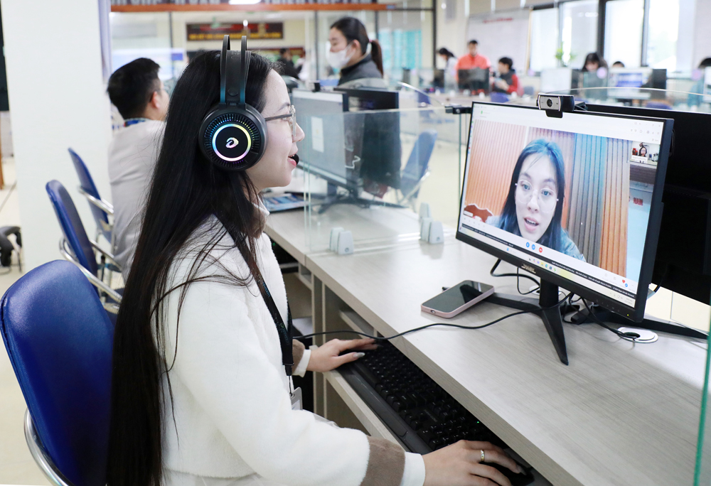 Nhân viên Công ty trách nhiệm hữu hạn Luxshare - ICT phỏng vấn lao động trực tuyến tại sàn giao dịch do Trung tâm Dịch vụ việc làm Bắc Ninh tổ chức. |