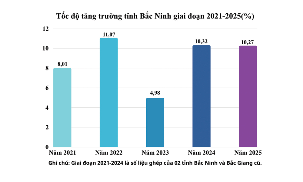 Theo Thống kê Bắc Ninh, năm 2025, Bắc Ninh có mức tăng trưởng kinh tế ấn tượng, đạt 10,27%, đứng thứ 5/34 tỉnh, thành phố trong cả nước. Thành quả này có được là nhờ sự đoàn kết, vào cuộc quyết liệt của cả hệ thống chính trị, sự ủng hộ của Nhân dân và cộng đồng doanh nghiệp dưới sự lãnh đạo, chỉ đạo sâu sát, kịp thời của tỉnh. Đây cũng là kết quả từ sự kế thừa phát triển của những năm trước.