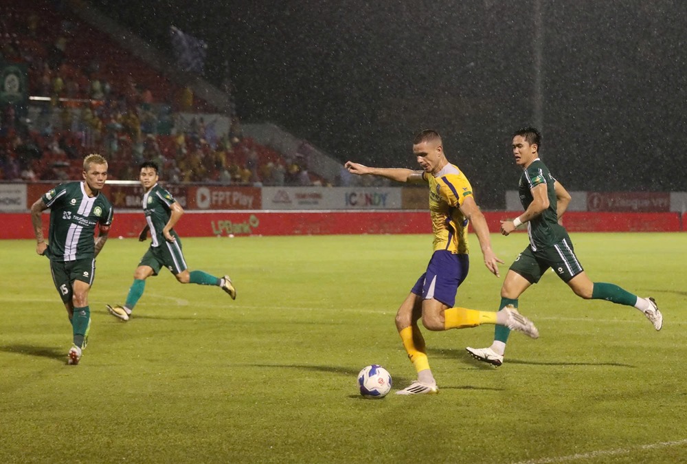 Trận đấu diễn ra chặt chẽ với nhiều pha tranh chấp quyết liệt của cầu thủ 2 đội. |