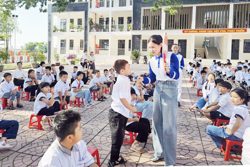 Các em học sinh được tham gia hoạt động tìm hiểu về Luật Trật tự, an toàn giao thông đường bộ; hướng dẫn cách đội mũ bảo hiểm đúng quy cách, bảo đảm an toàn và thoải mái khi di chuyển bằng xe mô tô, xe gắn máy hoặc xe đạp điện.