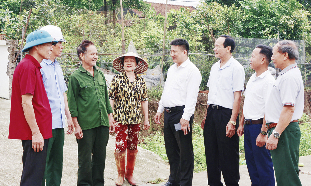 Lãnh đạo thôn Quyền, xã Hoàng Vân thăm hỏi, động viên các gia đình tự nguyện hiến đất, tháo dỡ công trình mở rộng đường giao thông. |