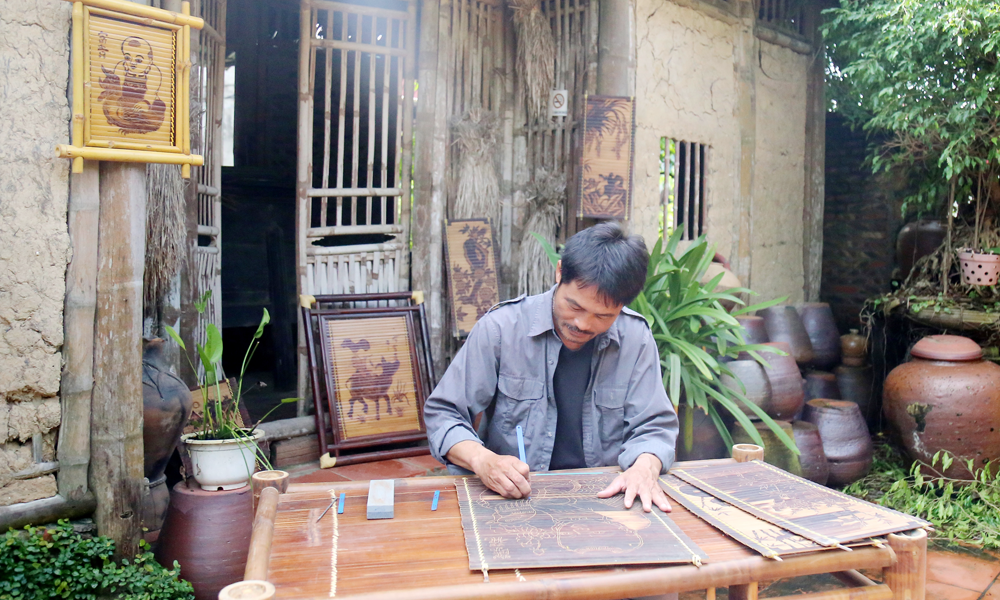 Nghệ nhân Ưu tú Nguyễn Văn Kỷ hoàn thiện bức tranh “Em bé ôm gà” trên chất liệu tre hun khói. |