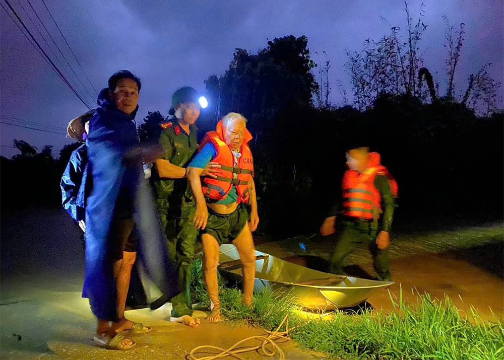 Cán bộ Công an xã Xuân Lương hỗ trợ người cao tuổi di chuyển đến nơi an toàn ngay trong đêm 6/10. |