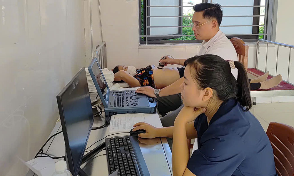 Bác sĩ Bệnh viện Đa khoa Anh Quất siêu âm cho người dân tại Trạm Y tế Ngọc Lý (xã Tân Yên). |