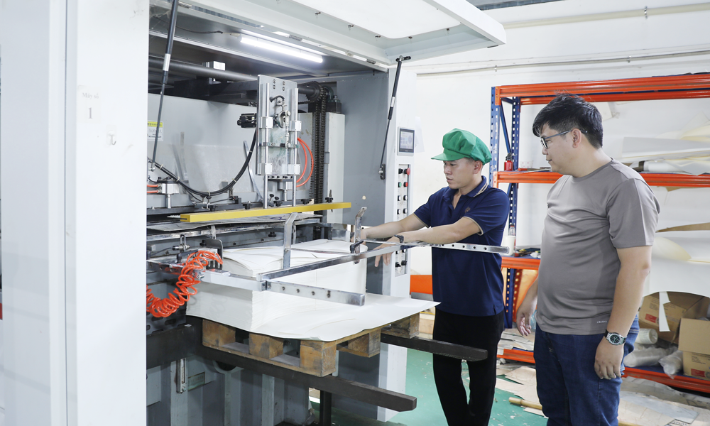 Anh Đặng Ngọc Bắc (bên phải) bên máy tạo hình cốc giấy do Trung tâm Phát triển công thương Bắc Ninh số 2 hỗ trợ đầu tư mua sắm. |