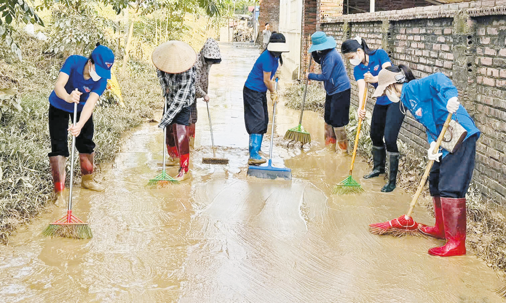 Người dân xã Hợp Thịnh dọn dẹp đường làng sau lũ. |