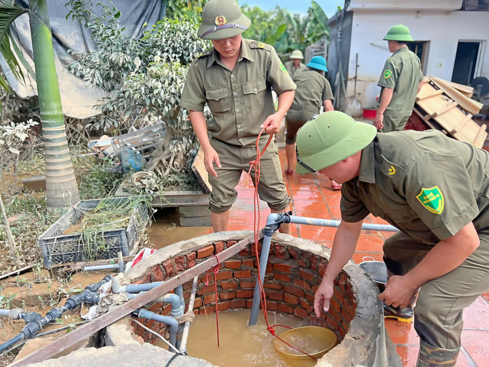 Công an viên xã Tiên Lục giúp người dân làm sạch giếng nước. |