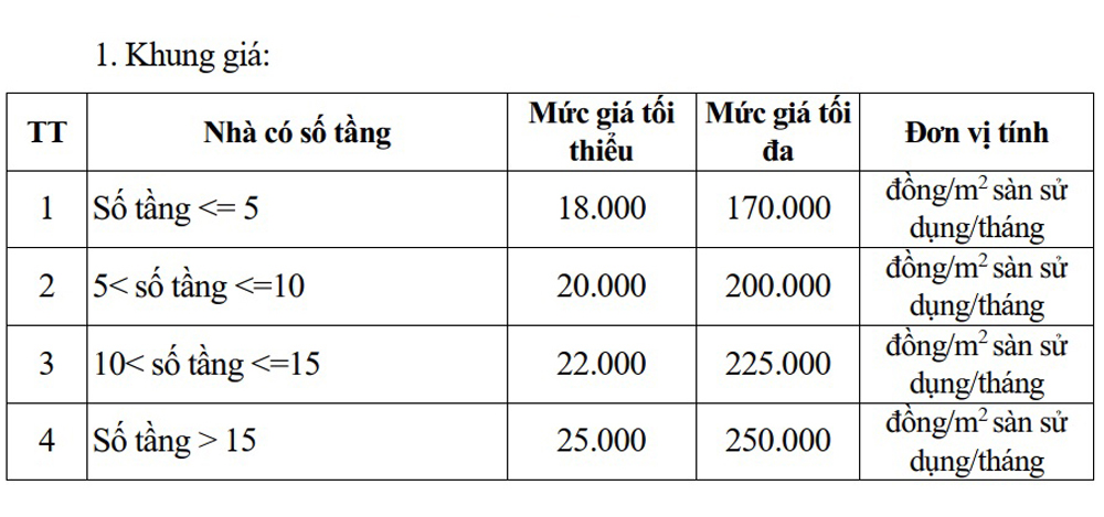 Đối với nhà chung cư có thang máy, mức giá tối thiểu là 2.800 đồng/m2 sàn sử dụng/tháng; mức giá tối đa là 12.600 đồng/m2 sàn sử dụng/tháng.