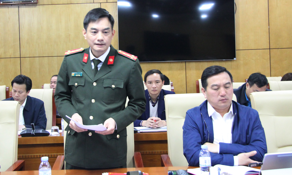 Đại tá Đỗ Đức Trịnh, Phó Giám đốc Công an tỉnh phát biểu tại hội nghị. |