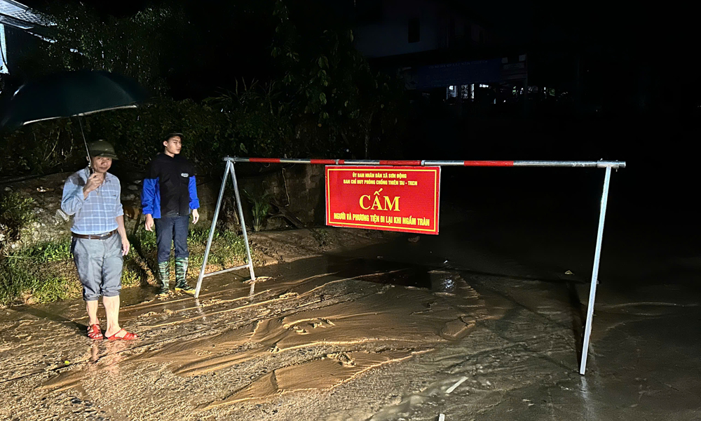 Tại xã Sơn Động, khi đồng hồ điểm 21 giờ, mưa vẫn nặng hạt. Nhiều tuyến đường liên thôn, điểm giao thông bị chia cắt, một số hộ dân phải sơ tán tại chỗ hoặc sang nhà người thân ở nhờ ngay trong đêm. Trên các tuyến đường, đèo dốc có vị trí sạt lở, ngầm tràn, lực lượng ứng trực đã căng dây, đặt biển cảnh báo để ngăn người dân qua lại.