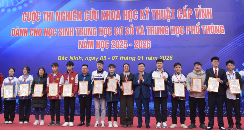 BẮC NINH - Sau 2 ngày diễn ra sôi nổi, chiều 6/1, tại Trường Trung học phổ thông Chuyên Bắc Ninh (phường Kinh Bắc), Sở Giáo dục và Đào tạo tỉnh Bắc Ninh tổ chức tổng kết và trao giải Cuộc thi nghiên cứu khoa học, kĩ thuật dành cho học sinh trung học cơ sở và trung học phổ thông cấp tỉnh, năm học 2025 - 2026 (gọi tắt là Cuộc thi).