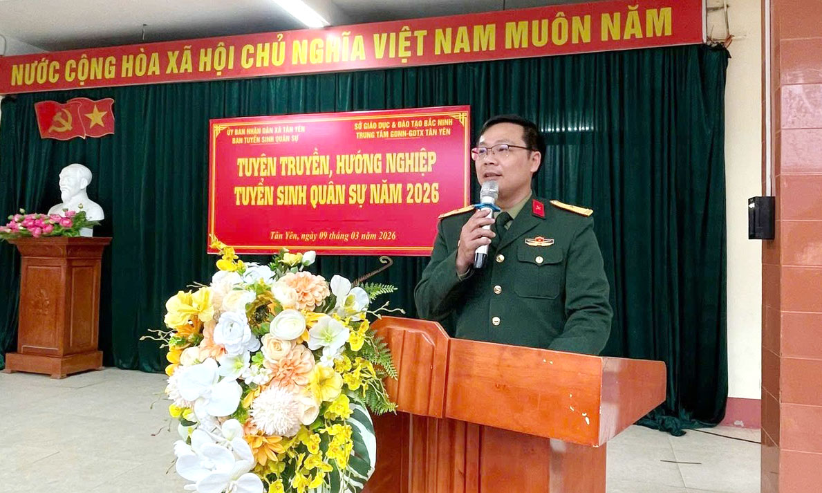 BẮC NINH - Từ ngày 9 đến 17/3, Bộ Chỉ huy quân sự tỉnh Bắc Ninh chỉ đạo ban chỉ huy quân sự các xã, phường phối hợp với các trường trung học phổ thông, trung tâm giáo dục nghề nghiệp, giáo dục thường xuyên trên địa bàn tỉnh tổ chức tuyên truyền, tư vấn, hướng nghiệp tuyển sinh quân sự vào các học viện, trường trong quân đội năm 2026.