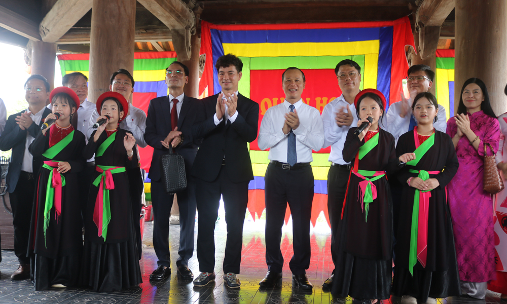 PPC Vice Chairman Mai Son and People’s Artist Xuan Bac enjoy Quan ho folk songs performed by children at Do Temple. |