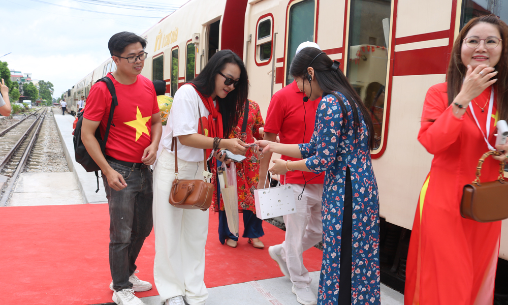 PPC Vice Chairman Mai Son, together with leaders of the Department of Culture, Sports and Tourism and Tu Son ward, welcomes the first visitors of the cultural tourism train at Tu Son station. |