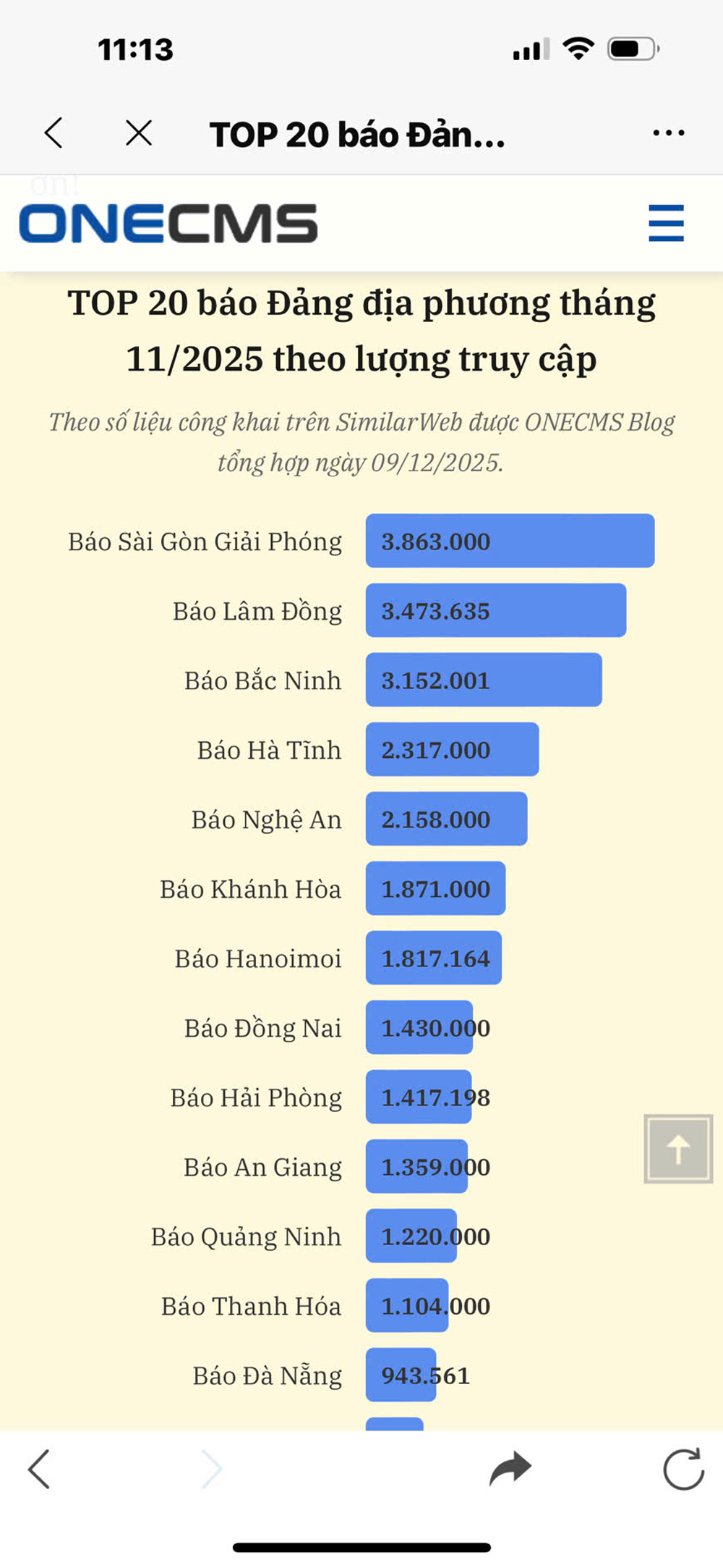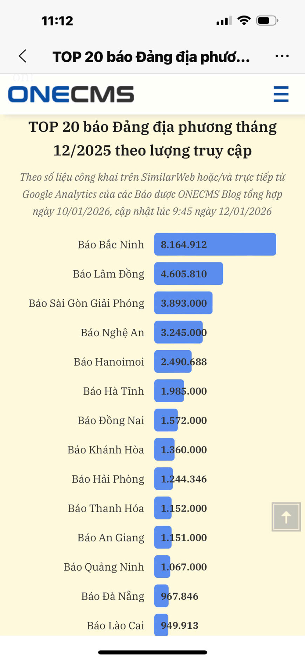 Theo bảng xếp hạng Top 20 báo Đảng địa phương tháng 12/2025 do ONECMS Blog tổng hợp từ dữ liệu công khai trên SimilarWeb và số liệu trực tiếp từ Google Analytics của các cơ quan báo chí, Báo Bắc Ninh đạt 8.164.912 lượt truy cập, đứng đầu toàn quốc. Bảng xếp hạng được ONECMS cập nhật lúc 9 giờ 45 phút ngày 12/1/2026.