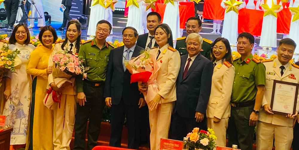 Các đồng chí: Phạm Minh Chính, Thủ tướng Chính phủ; Đỗ Văn Chiến, Chủ tịch Uỷ ban Trung ương MTTQ Việt Nam chụp ảnh lưu niệm với các tác giả đoạt giải. |