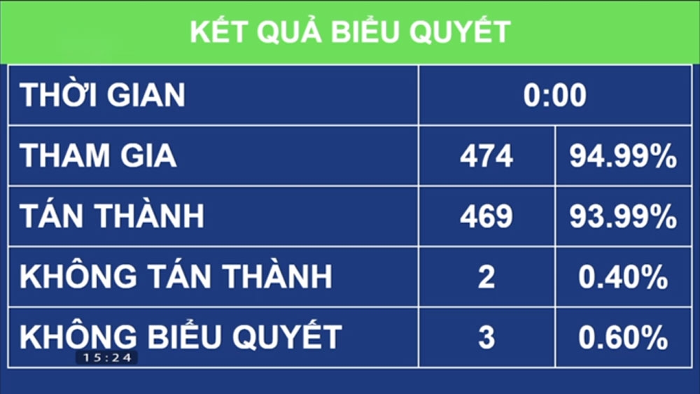 Kết quả biểu quyết có 472/473 đại biểu tán thành (chiếm 94,59% tổng số đại biểu), Quốc hội đã thông qua Nghị quyết Kỳ họp bất thường lần thứ nhất, Quốc hội khóa XV.
