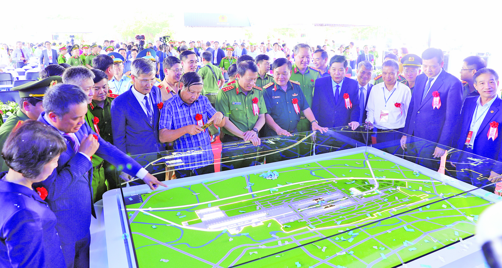 Đại tướng Lương Tam Quang, Ủy viên Bộ Chính trị, Bộ trưởng Bộ Công an; các đồng chí lãnh đạo tỉnh Bắc Ninh và đại biểu tham quan mô hình Cảng hàng không quốc tế Gia Bình tại Lễ khởi công dự án.