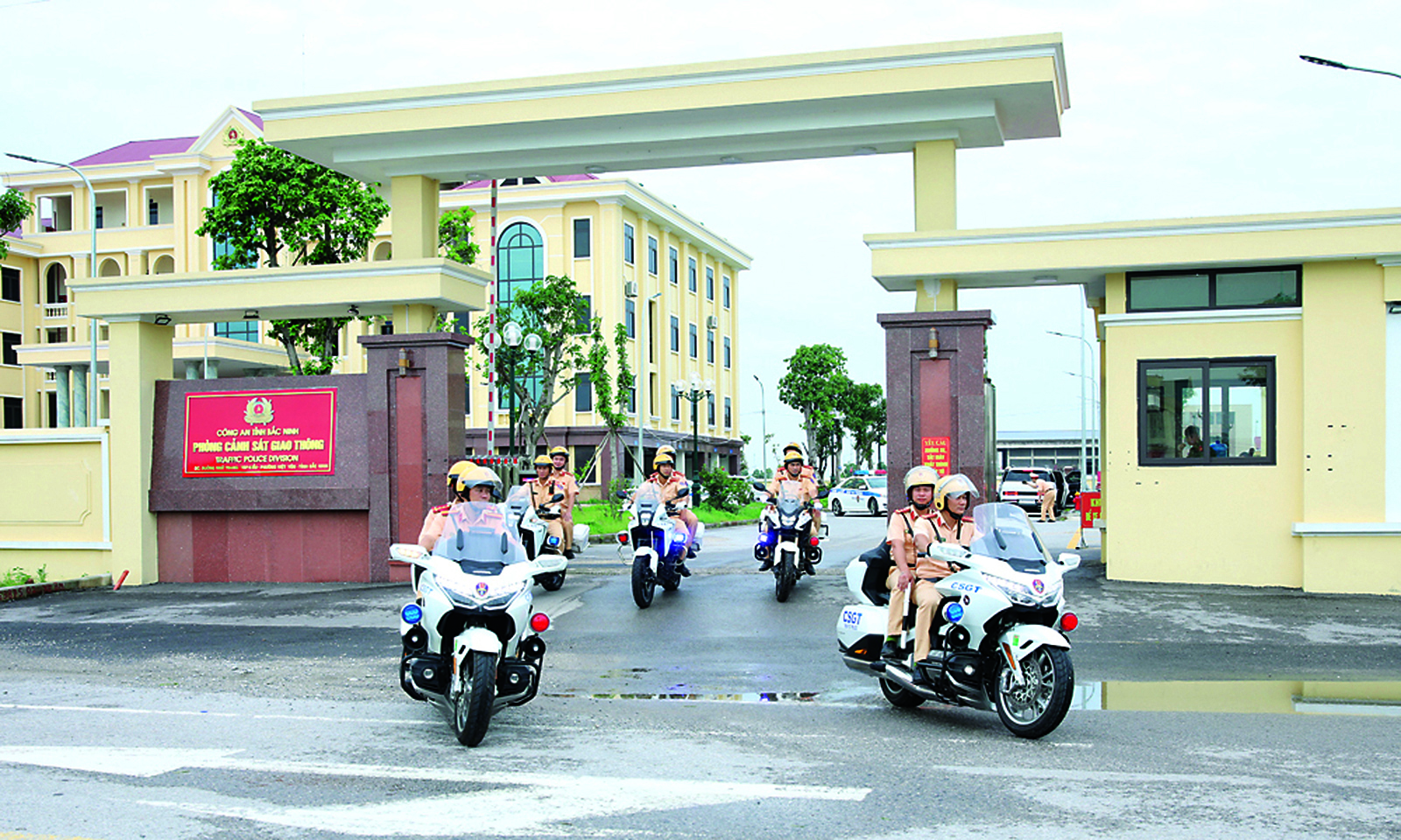 Cán bộ, chiến sĩ Phòng Cảnh sát giao thông (Công an tỉnh) ra quân thực hiện đợt cao điểm bảo đảm trật tự an toàn giao thông.