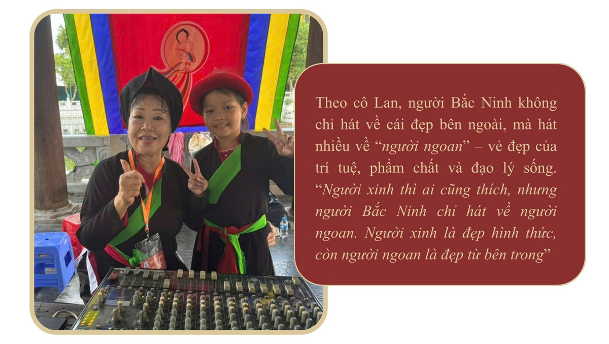 Theo cô Lan, Quan họ không nằm ở chuyện hát hay hay biểu diễn giỏi. Hát là điều ai cũng có thể học, nhưng Quan họ thì khác. Người học Quan họ không chỉ học làn điệu, mà còn học cách ứng xử, cách chia sẻ buồn vui, học từ nếp ăn nếp ở đến cách cư xử với nhau trong đời sống hằng ngày. Chính nền văn hóa ứng xử ấy đã tạo nên bản sắc rất riêng của người Bắc Ninh – Kinh Bắc, điều làm Quan họ khác biệt so với các loại hình dân ca ở những vùng miền khác.