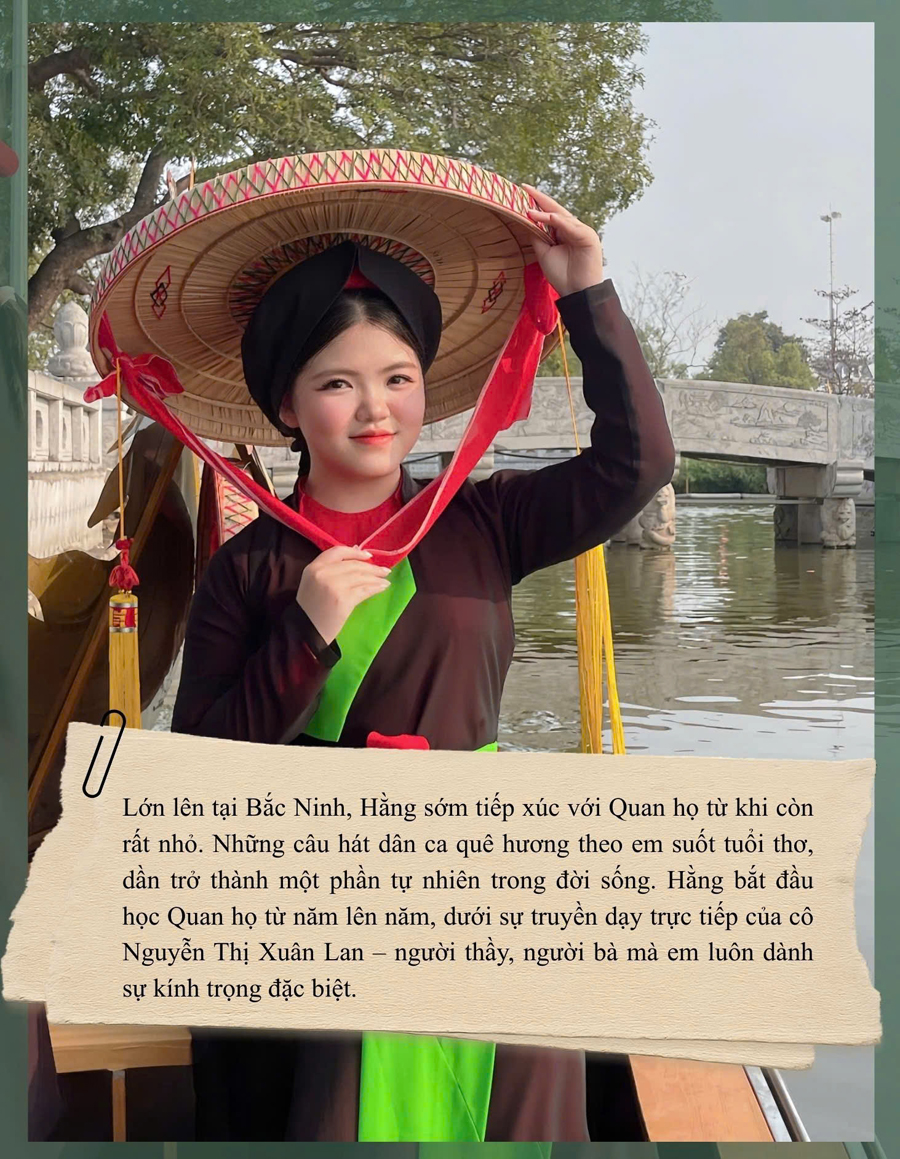 Với Hằng, đó không chỉ là mối quan hệ thầy – trò, mà còn là sự gắn bó bền chặt giữa hai thế hệ cùng chung một tình yêu với Quan họ. Những làn điệu Quan họ đã ngấm vào Hằng từ sớm, khiến việc học hát diễn ra tự nhiên. Nhưng điều quan trọng hơn là nền tảng mà cô Lan đặt cho em – không chỉ kỹ thuật, mà cả thái độ đối với Quan họ: sự trân trọng, khiêm nhường và ý thức trách nhiệm khi mang trên mình câu hát quê hương.