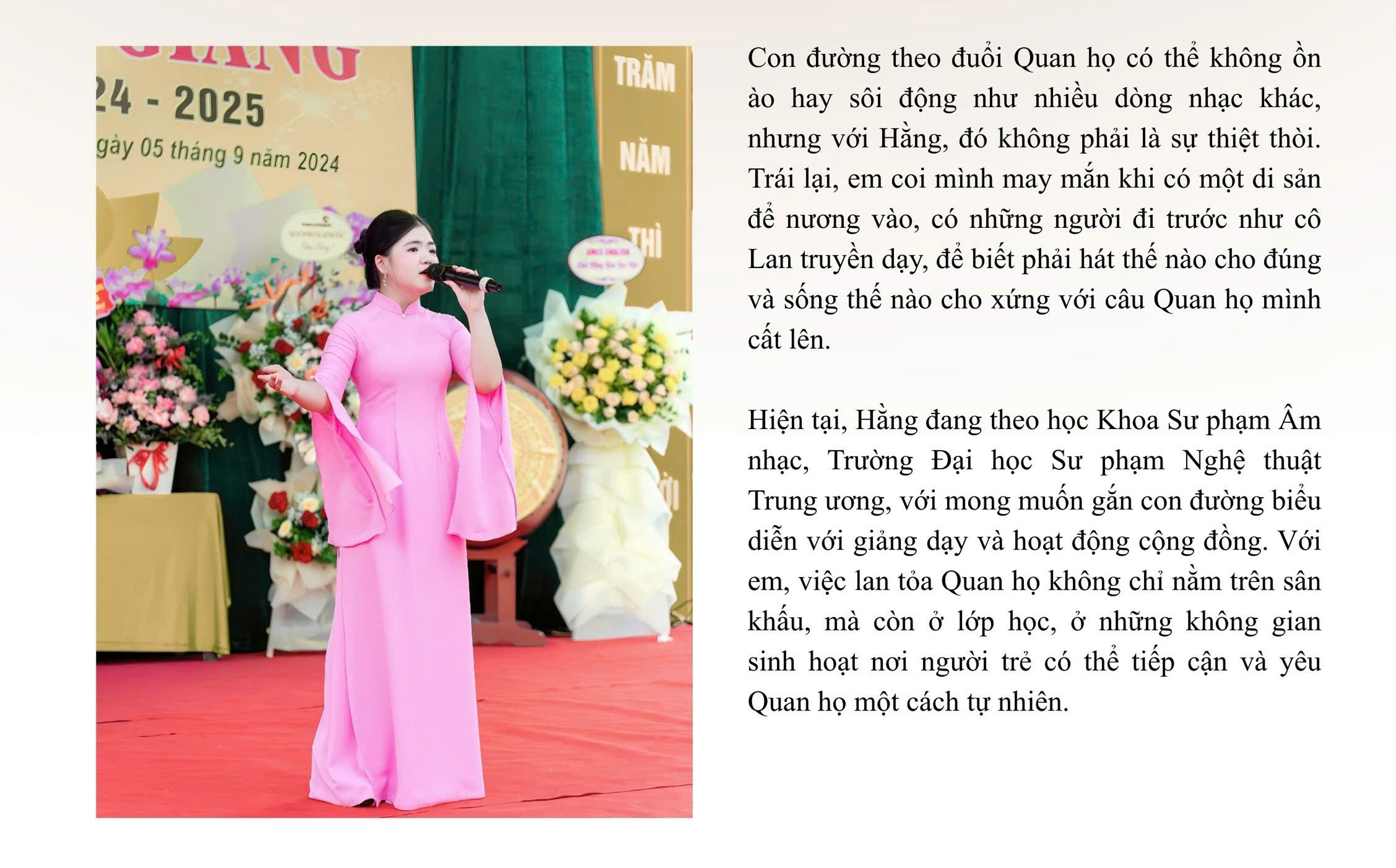 Từ lớp học Quan họ của bà Lan, nhiều thế hệ học trò đã trưởng thành. Trong số đó, Trần Thu Hằng là một người trẻ chọn tiếp tục gắn bó với Quan họ như một phần con đường học tập và theo đuổi nghệ thuật của mình.