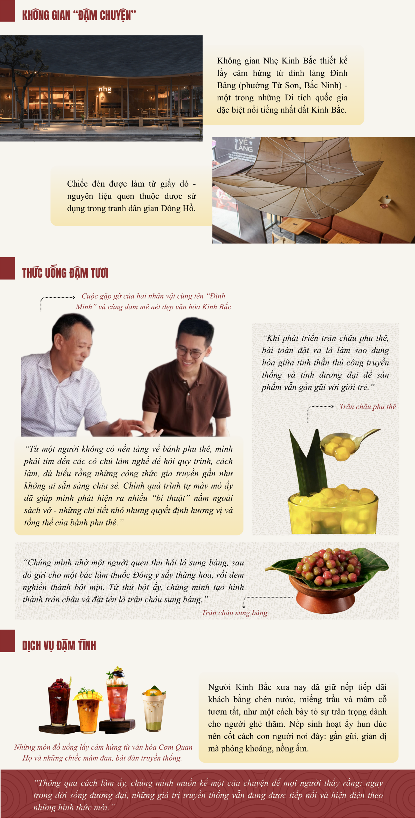Hành trình gìn giữ và lan tỏa văn hóa Kinh Bắc không chỉ được tiếp nối trong các gia đình nghệ nhân mà nay còn được chuyển hóa thành những cảm hứng “mới lạ”, hiện diện trong Nhẹ cafe - chuỗi thương hiệu mang sứ mệnh gìn giữ và tiếp nối tinh hoa văn hoá “trăm nghề" vùng Kinh Bắc.