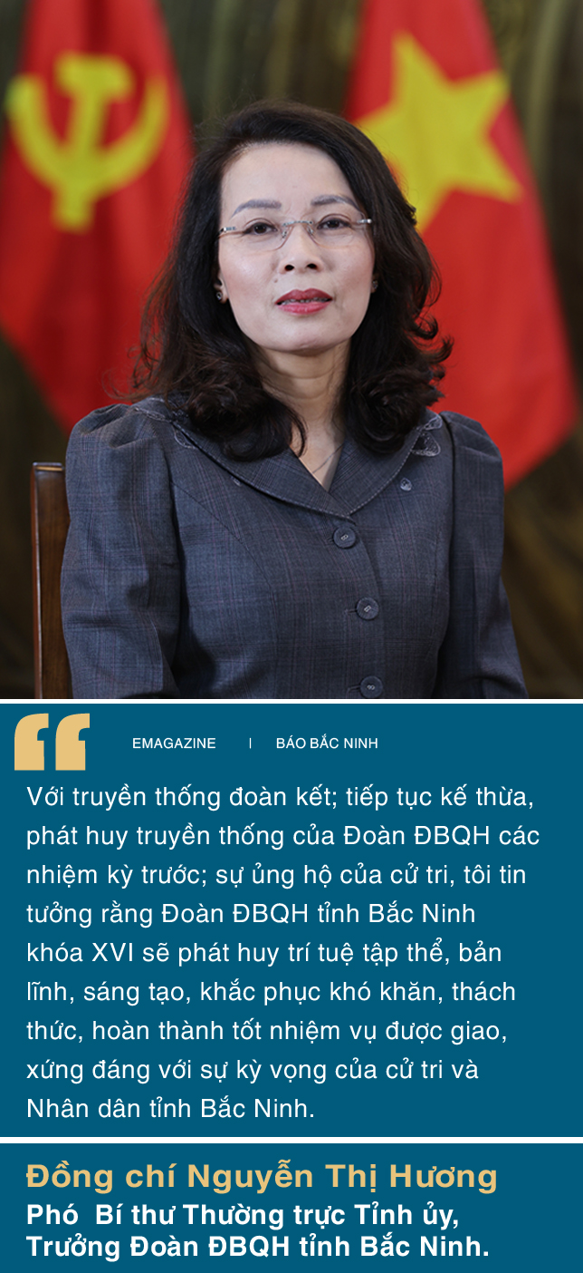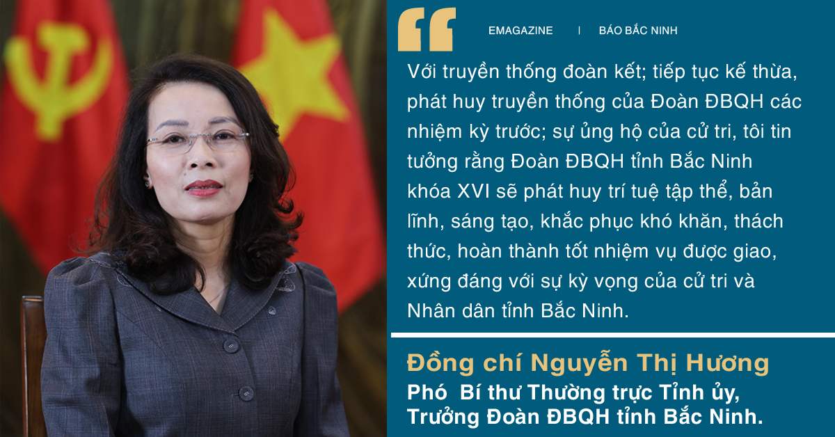 Đồng chí Nguyễn Thị Hương: Trước hết, tôi xin trân trọng cảm ơn gần 2,4 triệu cử tri tỉnh Bắc Ninh - nơi tôi sinh ra, gắn bó và trưởng thành, đã tin tưởng, tín nhiệm bầu tôi làm ĐBQH khóa XVI. Tôi trân trọng cảm ơn Ban Bí thư Trung ương đã giới thiệu, các đại biểu trong Đoàn tín nhiệm bầu tôi giữ chức Trưởng Đoàn ĐBQH tỉnh Bắc Ninh khóa XVI. Đây không chỉ là vinh dự của cá nhân tôi mà còn là trọng trách lớn lao trước Đảng bộ và cử tri tỉnh nhà.
