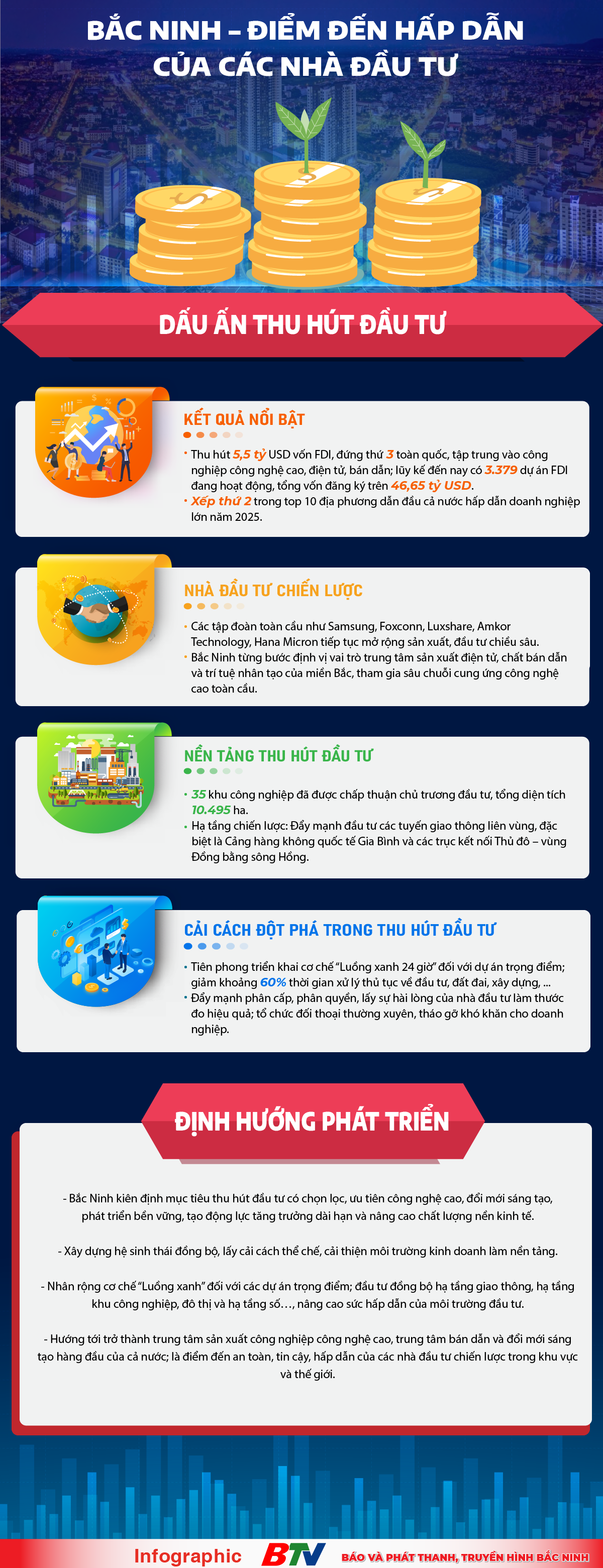 Bắc Ninh – Năm 2025, tỉnh Bắc Ninh tự hào là địa phương đứng thứ 3 toàn quốc về thu hút vốn FDI và xếp thứ 2 trong tốp 10 địa phương hấp dẫn doanh nghiệp lớn. Với môi trường đầu tư thông thoáng, quyết sách mạnh mẽ, hạ tầng đồng bộ và định hướng phát triển rõ ràng, Bắc Ninh tiếp tục khẳng định vị thế là một trong những địa phương dẫn đầu cả nước về thu hút đầu tư, điểm đến tin cậy của các nhà đầu tư trong nước và quốc tế, tạo động lực cho tăng trưởng nhanh và phát triển bền vững.