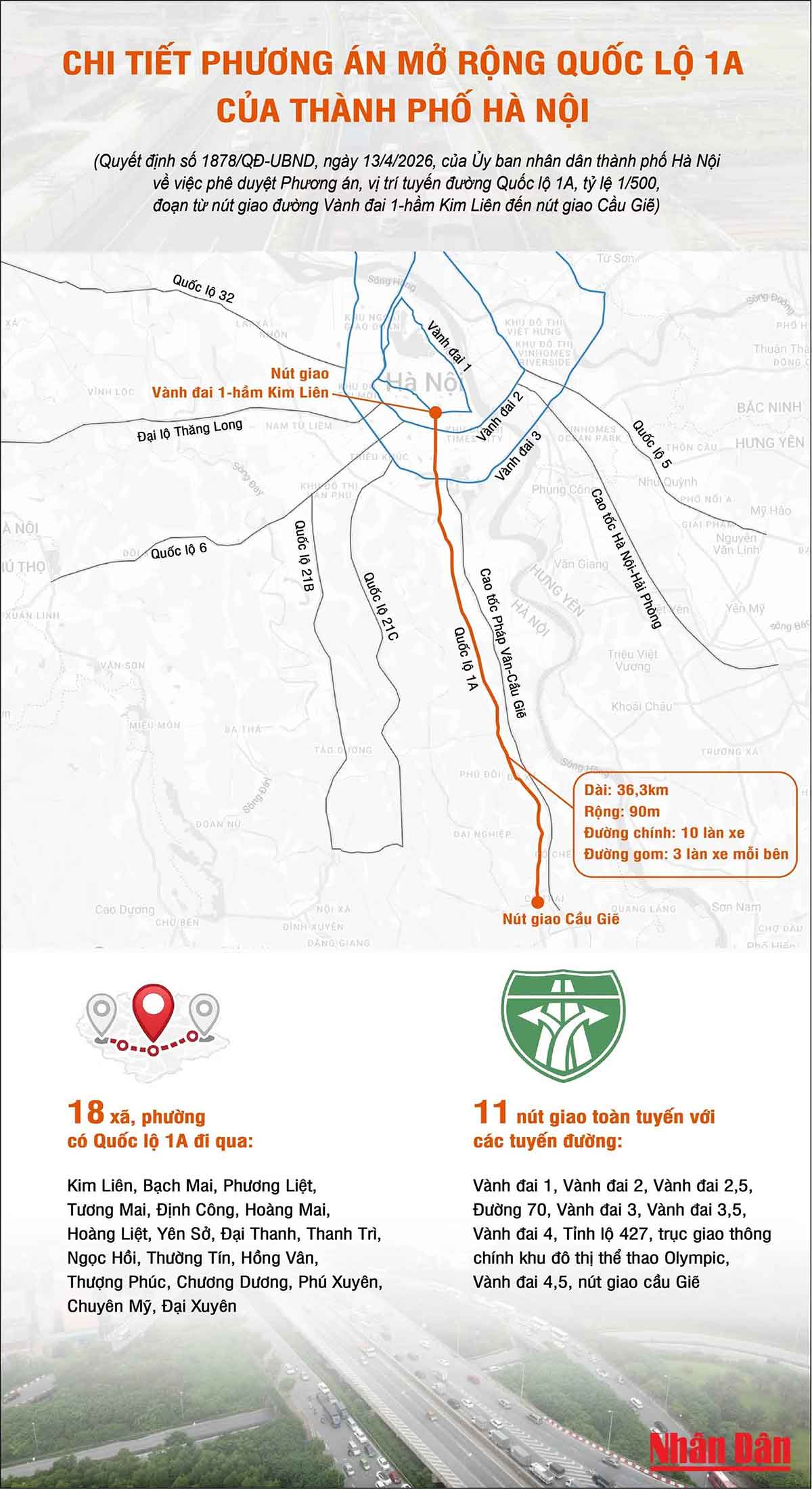 Thành phố Hà Nội phê duyệt phương án, vị trí tuyến đường Quốc lộ 1A, đoạn từ nút giao đường Vành đai 1-hầm Kim Liên đến nút giao Cầu Giẽ (Hà Nội), dài 36,3km, rộng 90m, với đường chính gồm 10 làn xe và đường gom mỗi bên 3 làn xe.