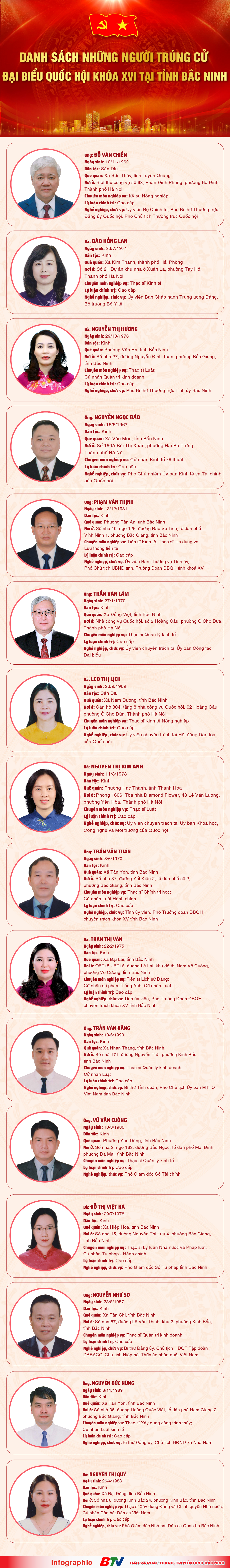 BẮC NINH - Chiều ngày 21/3, Hội đồng Bầu cử quốc gia công bố Nghị quyết số 232/NQ-HĐBCQG về kết quả bầu cử và công bố danh sách những người trúng cử đại biểu Quốc hội khóa XVI. Báo và Phát thanh, Truyền hình Bắc Ninh trân trọng đăng danh sách những người trúng cử đại biểu Quốc hội khóa XVI tại tỉnh Bắc Ninh.