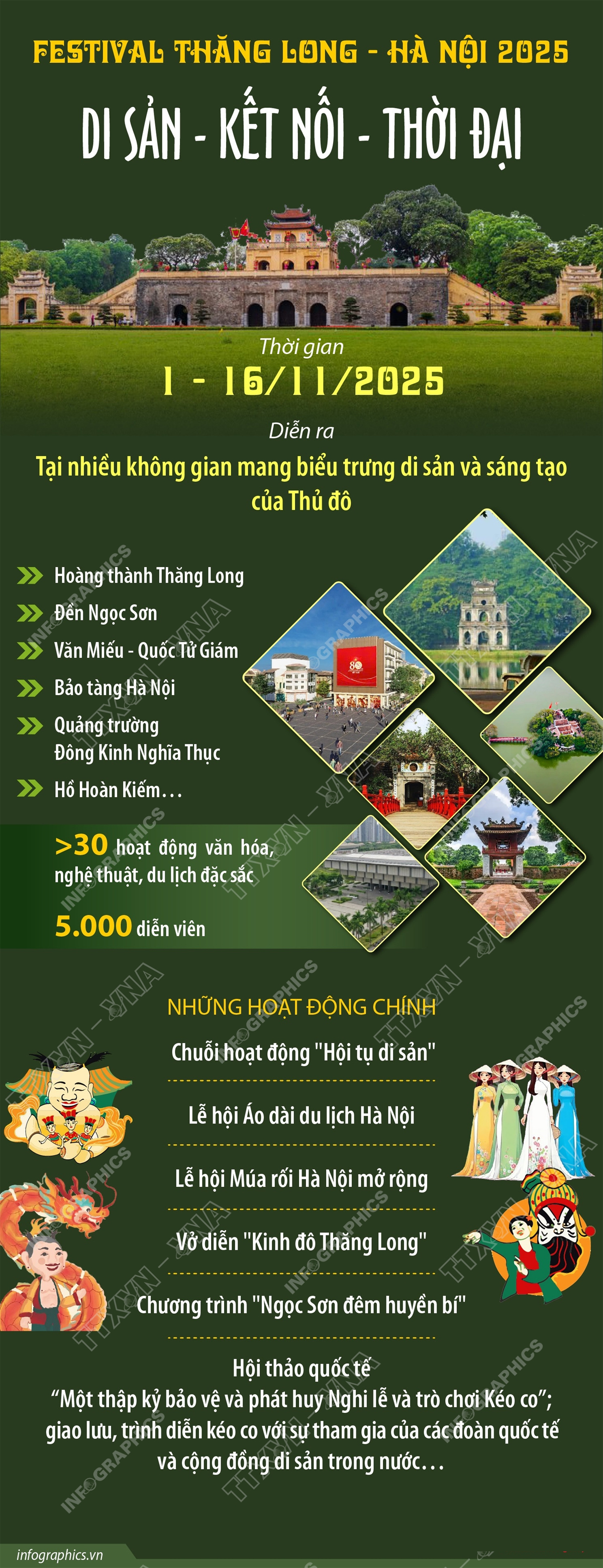 Lần đầu tiên được tổ chức, Festival Thăng Long - Hà Nội 2025 với chủ đề “Di sản - Kết nối - Thời đại” diễn ra trong 16 ngày (từ 1 đến 16/11/2025) tại nhiều không gian văn hoá của Hà Nội. Festival hướng tới tôn vinh giá trị di sản văn hóa ngàn năm Thăng Long - Hà Nội, lan tỏa tinh thần “Di sản - Kết nối - Thời đại”, đồng thời khẳng định vị thế của Hà Nội trong Mạng lưới các Thành phố Sáng tạo UNESCO.